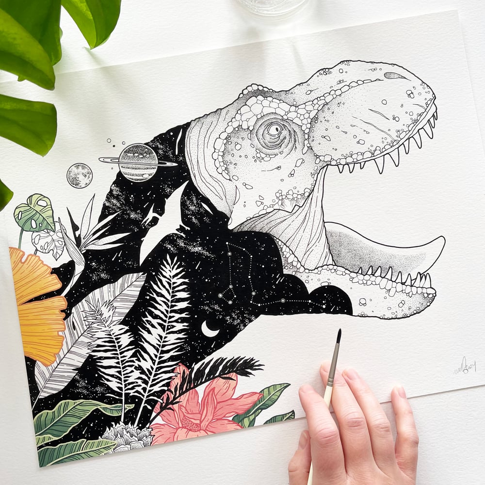 Botanical Tyrannosaurus, hand-embellished fine art print