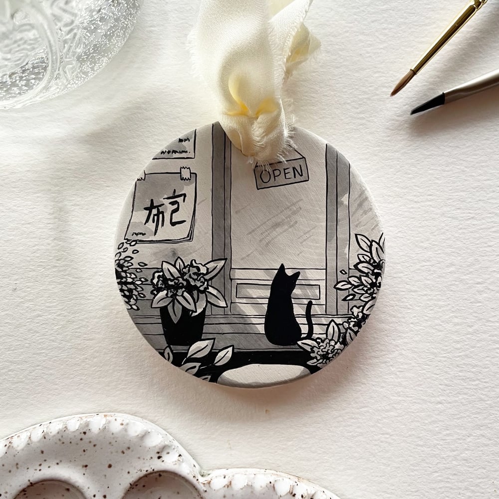 Hand-painted with ink and acrylic gouache, this one-of-a-kind manga-inspired ornament will add a little whimsy to your Christmas tree (or wherever you choose to hang it!).