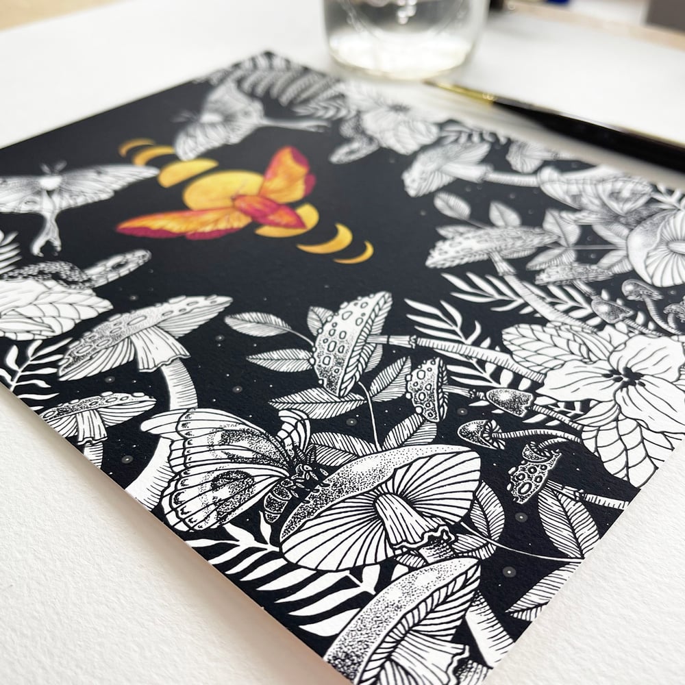Please note: We are only a two person team. We process all of our own prints and hand-embellish them (if needed) at the time of order, so please be patient while we prepare your lovely little piece of artwork for shipment!
